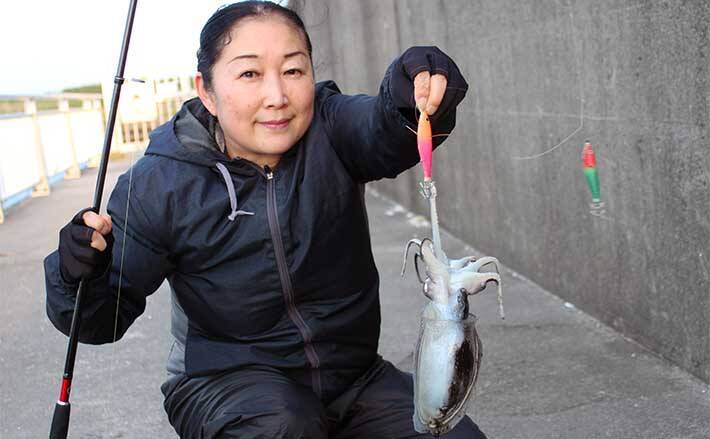 アタリがないまま、18時半に誘いを入れようと竿を動かすと重い。そのまま巻き上げると待望のシリヤケイカをゲット。