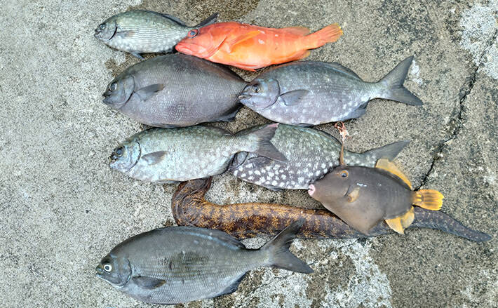 このあと、イスズミや小メジナが入れ食い状態。エサを付けて竿を置くと、5分以内に竿先が水面に突き刺さる。次第に、イスズミとイシガキフグは、アタリと引きの違いが分かるようになってくる。