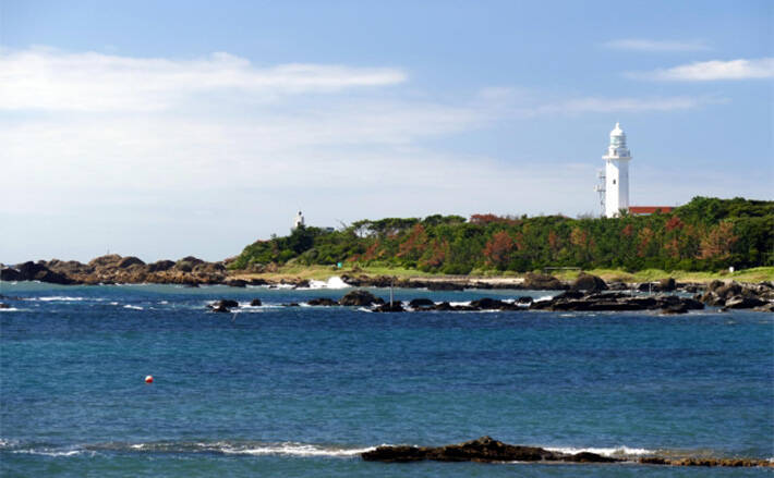 野島崎灯台は房総半島の最南端に位置する灯台です。1923年の関東大震災で一度倒壊しましたが、白色コンクリート造りで再建されて「白鳥の灯台」として親しまれています。