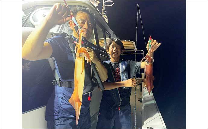 8月19日、福岡市中央区港かもめ広場前から第一ゆひな丸1号艇どらごんが玄界灘の夜焚きイカ釣りに出船。集魚灯の点灯直後からパラソルサイズなど大型がヒット。船長は「とにかく型がよかった。ブトウイカも交じった」と話し、午前0時前に雷が鳴ったことで早めの納竿。イカは良型揃いで60尾と好捕。9月中旬から落とし込み釣り出船。2号艇の飛龍は秋から近海のタイラバ・ジギングなどに出船。