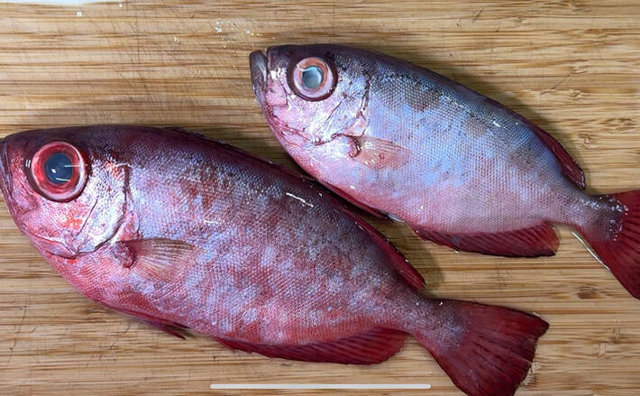 最も大きくなり、また深いところに棲むチカメキントキでも水深200m前後、キントキダイやゴマヒレキントキでは5m程度の場所でも釣れることがあります。彼らは夜行性で、暗い光の中で目立たずに、僅かな光で餌を探しているために深海魚と同じような形状をしているのだと思われます。