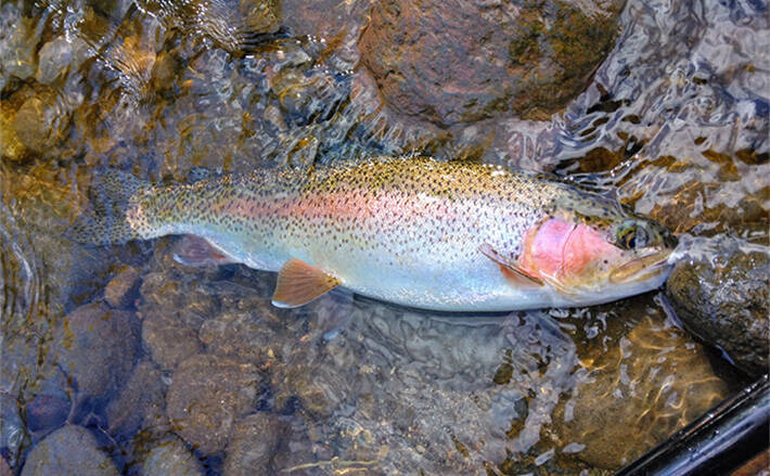 ジャンプこそないものの腰を落として竿の曲がりと糸鳴りを楽しんで取り込んだのは完璧な色合いとフォルムのワイルドレインボー。サイズは40cmと初挑戦としては納得の1尾。