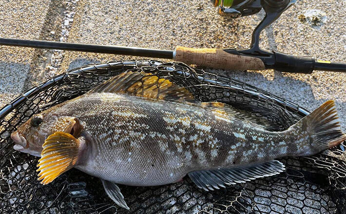 同じポイントで粘ること数分。同じ40cm級のアイナメをキャッチ!時合を捉えることができていたので、タックルセッティングはそのまま、トレースするコースを微妙に変えつつキャッチに成功しました。