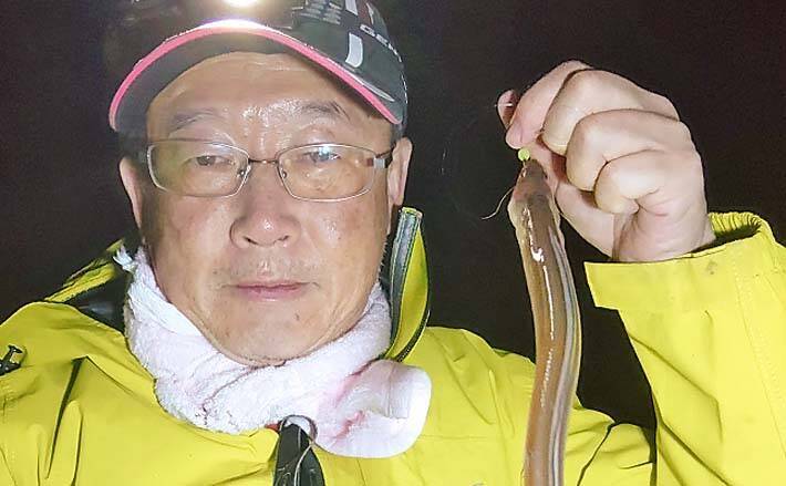 2投目、回収しようと軽くアワセを入れてリールを巻くと重みを感じ、同時に魚が泳ぐ感触もある。何か食ったようだが、もしかしてアナゴか。慎重に回収すると、アベレージサイズのアナゴが掛かっていた。