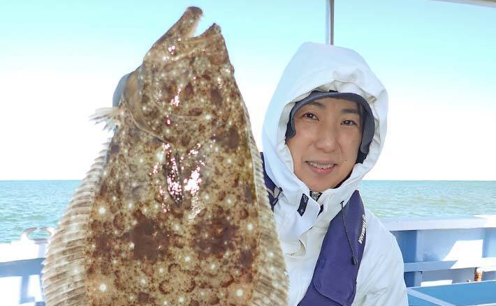 沖上がりまで、1時間半残す時間となったころ、心なしか潮色がいくぶん澄んできたようだ。すると、左舷トモに座る水谷さん(足立区)の竿が曲がり、1kg超えの肉厚ヒラメが取り込まれた。