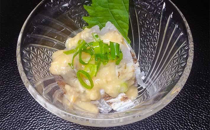 炙ったあとは刺し身にして酢みそ(タレ)をかける。最後は刻みネギをのせればできあがり。寒い時期限定の絶品料理が味わえる。