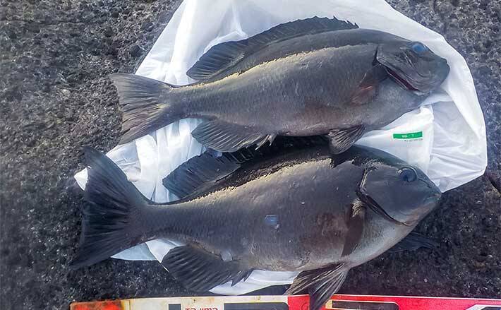 11時ごろ、同氏の竿が曲がり始め、35cmオーバーの良型メジナを連チャン。さらに、冬場に美味しくなるブダイなどもゲットした。