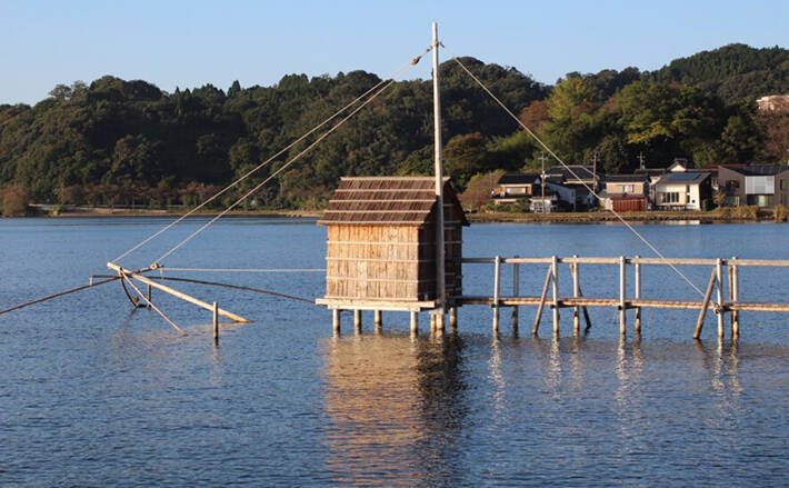 岡山県の夏~秋にかけての風物詩として有名な「四つ手網(よつであみ)漁」。約5m四方の網を4本のアームですくうため、この名前がつきました。