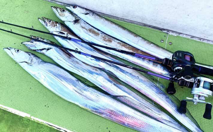 活性が高い時のアタリは、タチウオが海中でテンヤを咥えて下から突き上げるので、竿先を跳ね上げる手応えと、テンションが抜けるような軽さが出ることが多い。誘いで動かし続けている状態で違和感があったときには、アワセを入れてみるといいだろう。