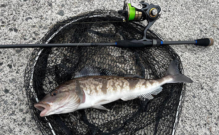 潮が動き始めた時間。まだ水温が低いとはいえ、このタイミングで動けるアイナメはいないかな?と思いライトリグでズル引きしていると、小気味良い金属バイトからフッキング!