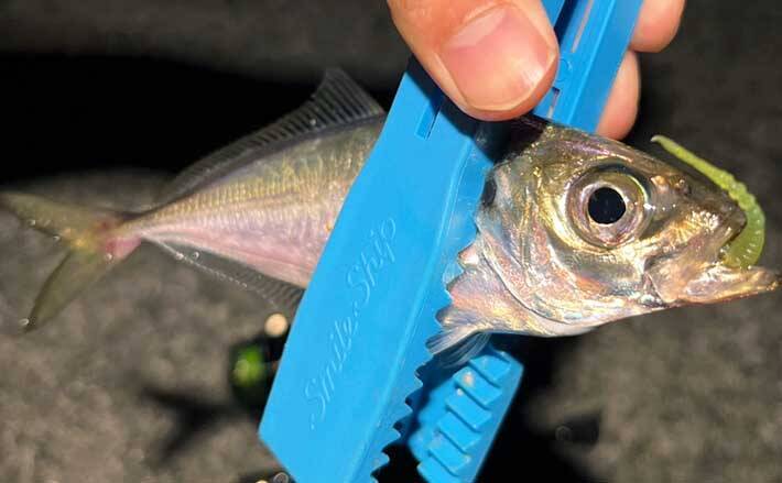 すかさずアジング用の2inchのワームを投げる。3カウント付近でチョンチョンとアクションを入れた後、止めると「コンッ」というアジらしいバイトが!しっかり合わせを入れ上がってきたのは15cm程のアジ!いるじゃん~と心の中でほくそ笑みながら2匹目を狙う。