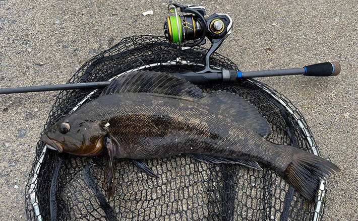 同じくホタテの作業船周りを、縦に細かくシェイクするようなワームの動かし方をして、ロッドに一気に重みが乗ったので合わせてヒット!35cm程のアイナメを追加です。