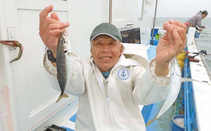 左舷トモの加藤さんもウイリーと、下バリはエサを付けてアジとタカベが半々の釣果。