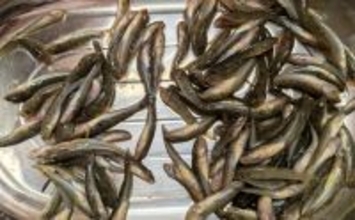 9時過ぎ、晴れて風が吹きだすと波立ってきたので、水深50cmに満たないヘチの石の間を探る。するとアタリがひん繁に出てハゼの仲間のチチブやクチボソに交じって体長4~6cmがぽつぽつと釣れた。
