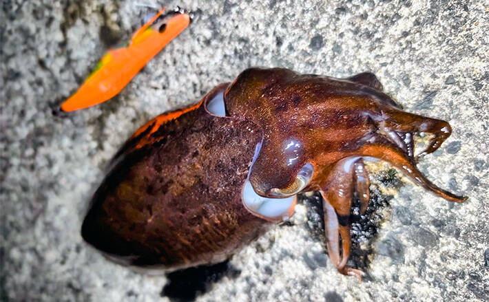 それでも釣り方に確信が持てた。そのまま続けていると、「モニュッ」としたアタリ。合わせると、上がってきたのはコウイカ(笑)。まぁ、底付近をやっていれば来る時は来る。で、その後はエギを変えても、釣り方を変えても、場所を移動しても何もなし。「無」の時間が続いた。