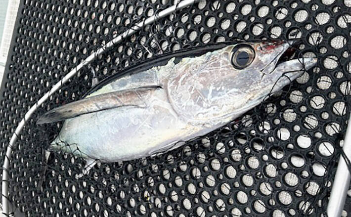 自分は絡み防止のために一度高速でジグを回収し、タイミングを見計らって2投目。90m付近でビタ止まり!ここから連続で3匹をキャッチすることに成功。あがってきたのは、なんとビンちゃん(ビンナガマグロ)。