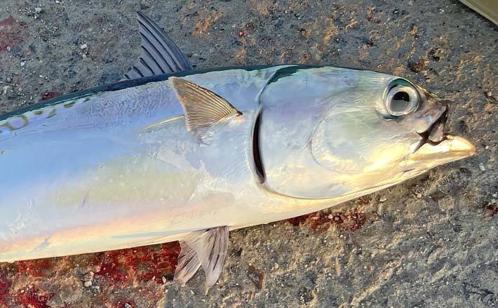 すると、間もなくしてアタリ。十分に引きを楽しんで本命をゲット。どうやら群れが回遊してくると、ルアーを巻いている人に掛かるようで、周囲が釣れていない時はダメな様子。