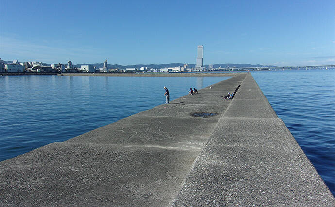近況は青物の回遊が一休みの状況で、釣行当日も誰も青物をヒットさせていない。当日は長潮の下げ潮で青物狙いには一層不向きな潮回りであったが、波止全体を見渡せば波止上はガラ空き。周りを気にせず広々とした釣り座でウキ流しスタイルでのノマセ釣りができる状況にはある。
