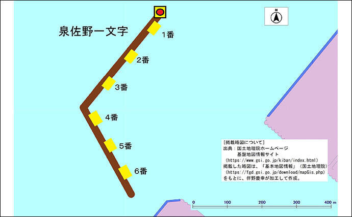 なお、泉佐野一文字の形状と船着場などは略図のとおりだが、詳しい解説は、以前の投稿「大阪湾の沖波止紹介:岸和田&泉佐野一文字 都市近郊でアクセス良好」をご覧いただきたい。