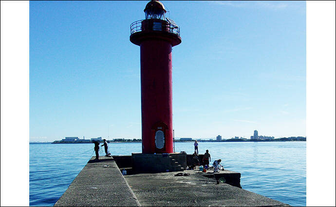 北端の赤灯台の一角に釣り座を構える理由は、そこが竿下サビキ釣りでノマセ釣りの活きエサとなる小アジと、引きの面だけでなく食味の面でも魅力的な中型アジの釣果があがる可能性が高いからだ。