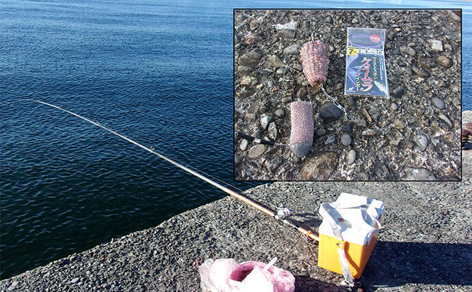 竿下サビキ釣りのタックルは、磯竿5号5.4mに、ミチイト4号を巻いた両軸リールをセット。撒き餌カゴはサビキの上下それぞれに付けるダブル方式とし、上カゴとサビキの間にクッションゴムを介する。サビキは白色のケイムラタイプのスキンで、ハリスは2号を選択した。