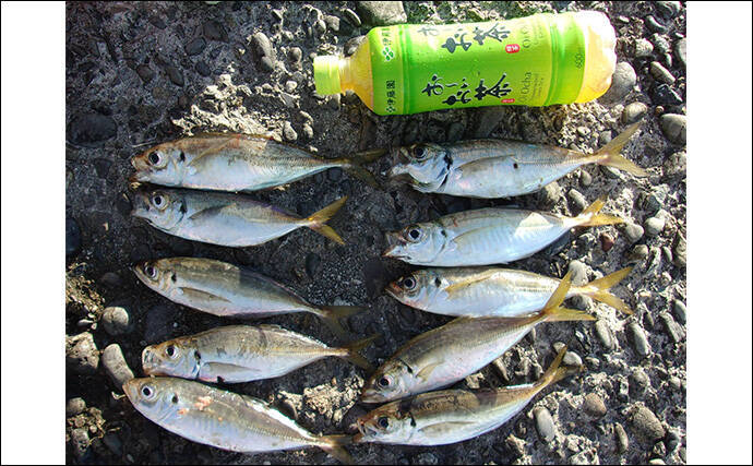 青物の回遊が一休みとなり、酷暑も相まって訪れる釣り人の数が少なくガラ空きとなっていた盛夏の泉佐野一文字は、私(筆者)にとっては狙い目(?)だった。普段はなかなか入れない人気の赤灯台周りで竿下サビキ釣りに挑んだ結果、中型も複数混じるアジの大漁となった。