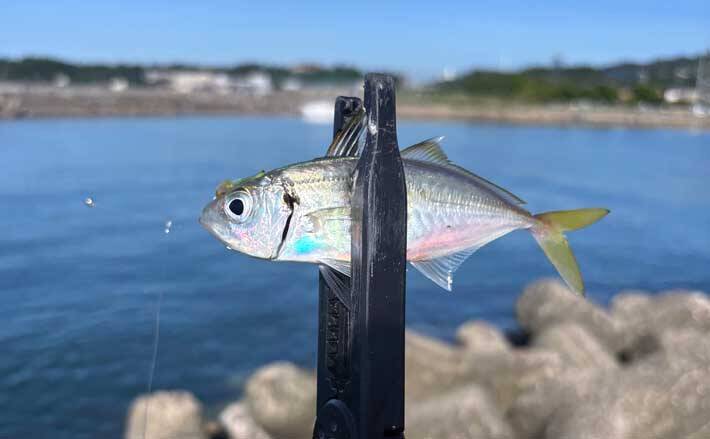 数投目で豆アジがヒット。群れが回っていたようで、同サイズのアジが連続してヒットした。