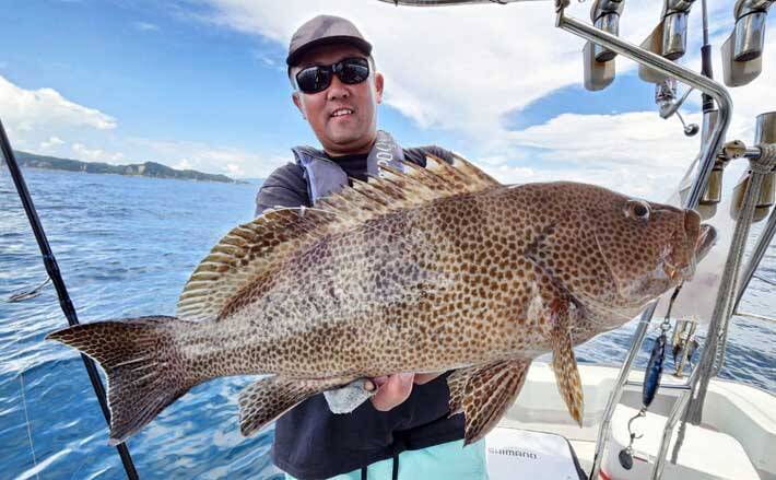 小雨になったタイミングで船を南下させて小ガン瀬周りで下げ潮が動きだすタイミングでちょうど船が入り、20mラインを流しているとゴンっ。ゴリ巻きして上がってきたのはビッグオオモン!