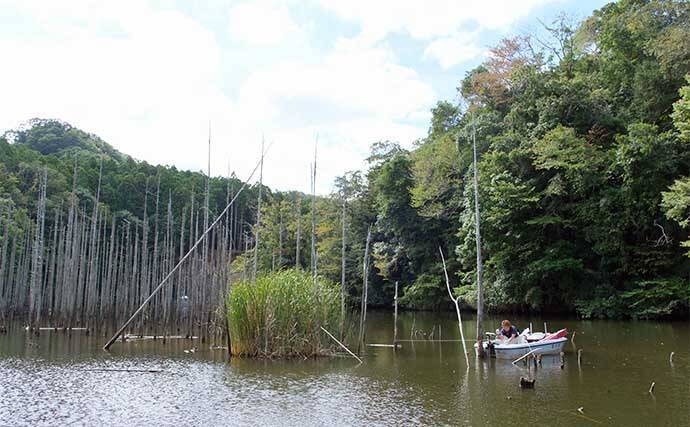 そもそも黒滝ってどこって話だが、もっとも近い舟宿はレンタルボート笹川になる。ボート桟橋を離れ東上流へ延々と進むと、やがて幻想的な立ち木群が出現する。このエリア一帯を通称・黒滝と釣り人は呼称する。