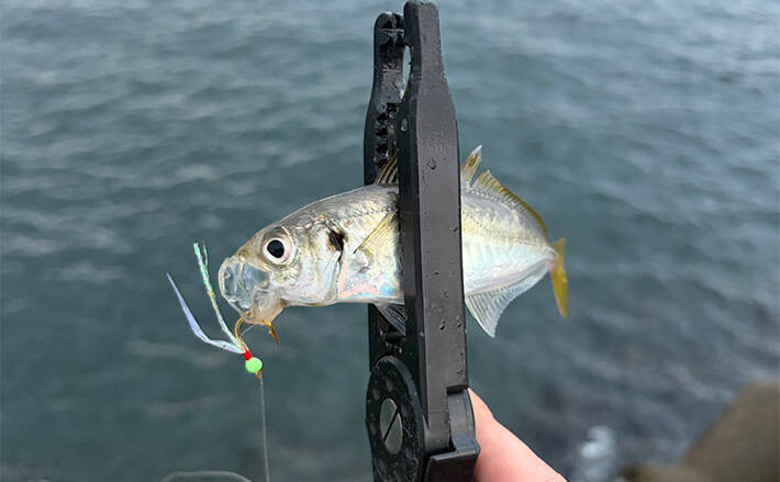 そんな中、結果的にはジグサビキ仕掛けに助けられた。メタルジグをフルキャスト。ジグにはつかなかったものの、ベイトの小魚の群れを模したジグサビキは、水潮下でも一定の集魚効果を発揮した。