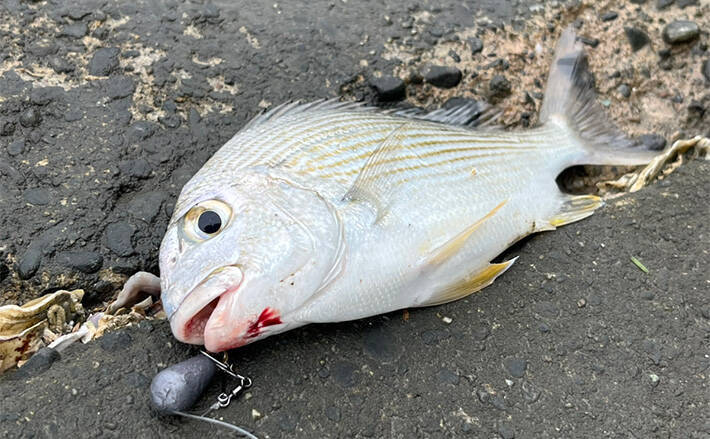 続けて投げると、今度はなんと本命のチヌが釣れた。しかし残念!筆者はチヌを求めて丸一年浜名湖に通い詰めているが、小チヌは認めないためカウントせず。