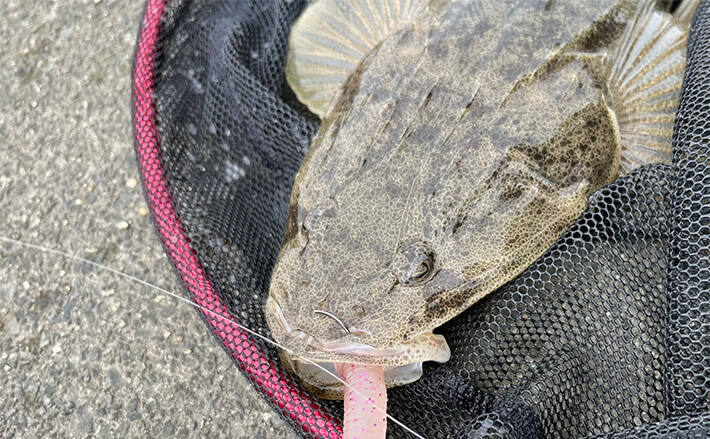 しっかりした重みが伝わりゴンゴンと強烈なファイト。バレないようにゴリ巻きを続ければ見えてきたのは白い腹にでかい口、マゴチの登場です。サイズは目測40cmと中型サイズ、まずは秋マゴチに出会えたことは何より嬉しいです。