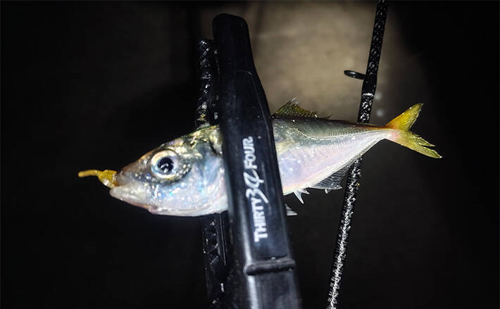 まずは0.4gからスタートしたが、反応が無いしタナが合ってない印象。実釣時間が限られていたため、3投で見切りをつけてジグヘッドを0.8gに変更。レンジをボトム寄りに取り、底を意識した釣りに切り替えると、アジの小さなアタリが出始めた。