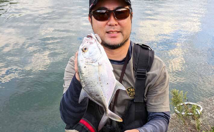 さらに岸壁沿いを歩きながらキャストを繰り返していた松尾さんが、突然「食いました~」とロッドを曲げた。コレが意外に強い引きを見せる。ジャーッとドラグが滑ってラインが出されるがそこはベテラン、丁寧にいなしてあっという間に浮かせた。見えたのは良型メッキ。しかもロウニンアジだ。