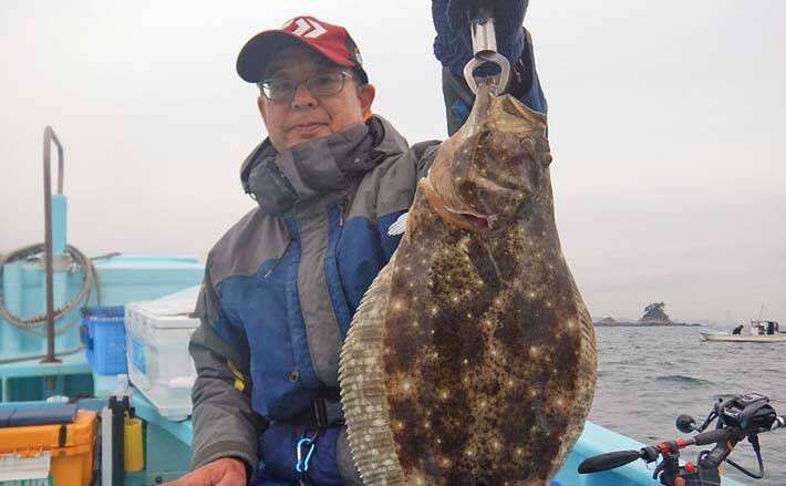 10分後にはドンとしたアタリで、グィグィとトルクのある引き。何だと思っていたら、なんと今度はヒラメが上がってきた。