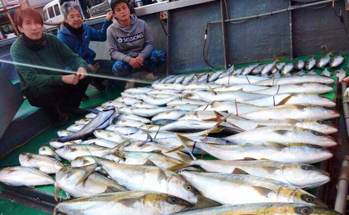 11月30日、福岡市中央区港かもめ広場前から、第一ゆひな丸・どらごんが玄界灘の落とし込み釣りに出船。ヒラマサ5~6kgを頭にヤズ、ハガツオなど交じってクーラー満タンの数釣り。大型のバラシは続いており、エサのイワシがいれば青物が食ってくる状況。時期は少し遅れている印象で、これからも青物釣りは大いに期待。