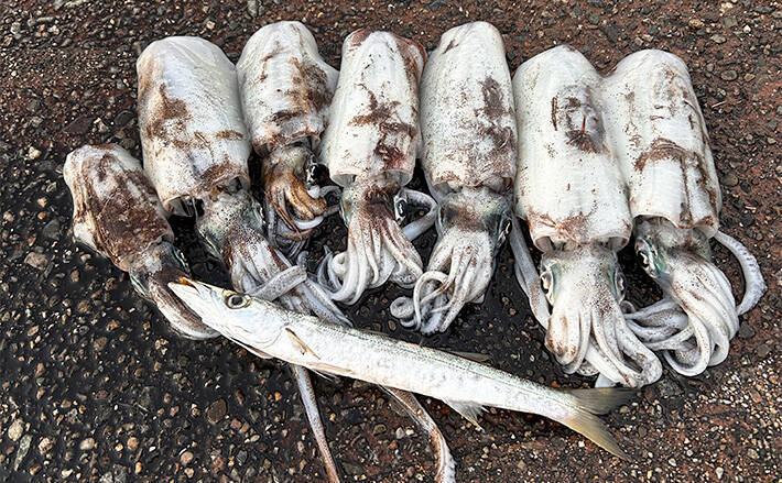 用意した18匹のアジで、15回あたりがありました。ほぼ1日中コンスタントにアタっていたことになります。型は200~300gと小ぶりのイカでしたが、7杯獲ることができ、1日中楽しむことが出来ました。