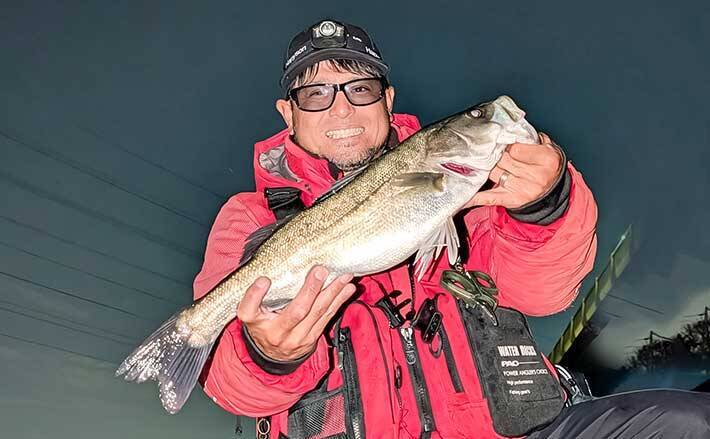 手前で強烈なエラ洗いをされるが、がっつりハリ掛かりしており勝負あり。やや強引に寄せてネットインさせたのは55cmほどの本命、衣浦シーバスだった。