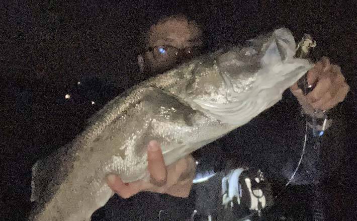 暗い沖にキャストして明るい海面にルアーを通すと「ガバっ」と豪快なエラ洗い。潮位が下がって剥きだしになったゴロタ石にラインがすれないよう、やや強引にいなす。