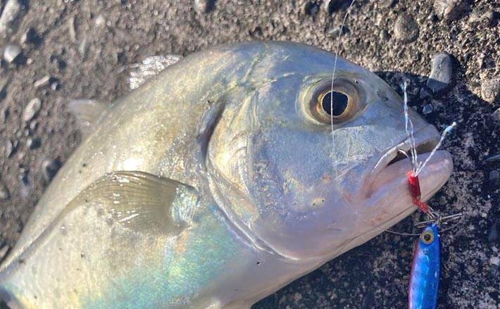 立ち位置を少しずらしながら探ると、やや沖で反応が出た。沖に群れていることが分かったため、今度はジグにフリーフォールのアクションを入れると、イトフケのアタリ。