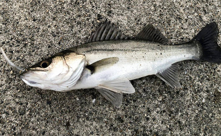 足元を見ると、そこそこなサイズのシーバスが右往左往しているので、堤防の壁際に沿ってキャストし、ピンテールワームをただ巻きに時折ダートを加えながら誘ってみると、面白いくらい下から飛び付いてくる。そして、ダート直後に少し早巻きを入れた瞬間小型がヒット!