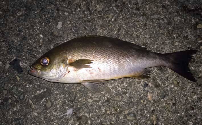 そんなことを思っているとその灯りが消える。豆アジよりは魚を感じられる。マシなアジか?と思い、引き上げると25cm程のイサキ。とりあえずスカリにキープ。同行者とイサキの気配を感じつつ投げる。