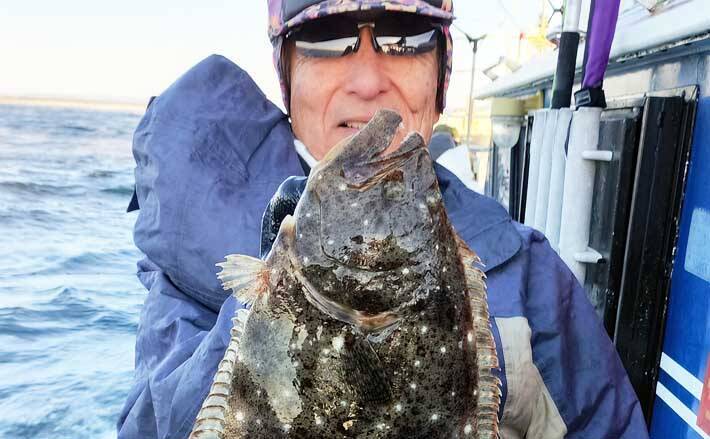 船中、ほとんどの人が2尾以上の釣果。私は3尾とゲストにマトウダイ、マダコ。港に戻ると、1号船も絶好調で、菊地さんが5kg超の大判ビラメを釣っていた。それを見た瀬口さんは、「バラしたのは、あれくらいあったかも」と残念がっていた。