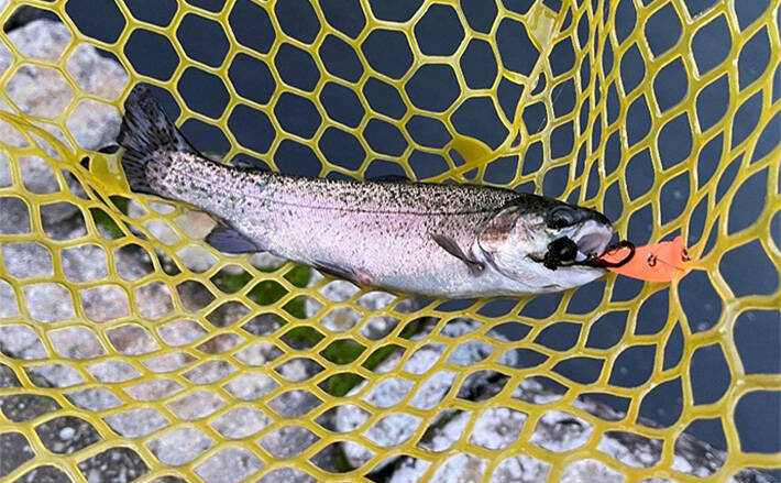 冬に入ったものの、まだ水温はニジマスにとっては少し高めの水温である現状。まだまだ表層パターンが残っているのでは?という考えから0.3gのマイクロスプーンを試してみることにした。ポツリポツリとヒットはするがどうもパターンというわけではなさそうだ。活性は高いものの追い切ってくる個体が少ないのも気にかかった。
