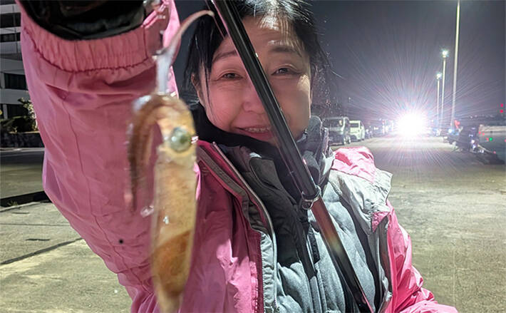 コーヒーを飲みながらウキを見ていると、妻が「ウキの動きが変!」と言ってサオを上げた。手応えがあるようで、巻き上げるとヒイカが掛かっていた。ボウズ覚悟の釣りだったのでうれしい1匹だ。すぐに周囲の釣り人から質問攻めが始まり「タナは1ヒロ(約1.5m)、あまり遠投せず常夜灯の明かりがきいているエリアだった」と妻が丁寧に答えていた。