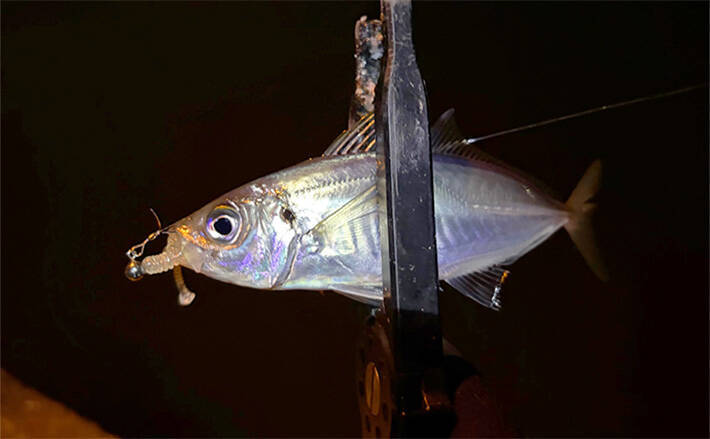 さすがに新月大潮という、常夜灯パワーが最大限に効くシチュエーションだ。アジの活性が普段とはまるで違う。時合いは30分程度で終わってしまったが、そのあとも5分と開かずアジが釣れ続けて、おそらく40尾近くは釣った。