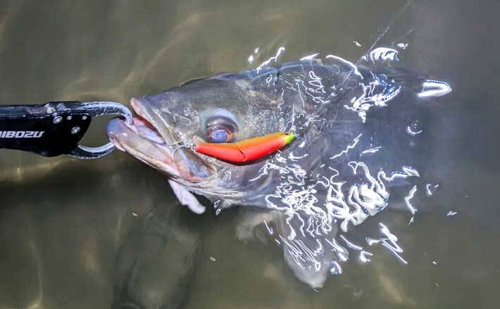 エラ洗いでポイントを荒らさないように静かにファイトしてキャッチ。納得のスズキサイズ!