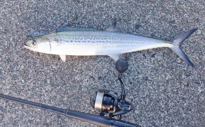 すると沖合でナブラ発生。ジグを40gのシルバーイワシに交換して沖に投げる。アタリがなく諦めた瞬間、ゴンゴンギューンゴツゴツでサオが大きく曲がり、リールのドラグがジージーッと鳴る。数分やり取りした末にタモに収まったのは53cmのサゴシ。
