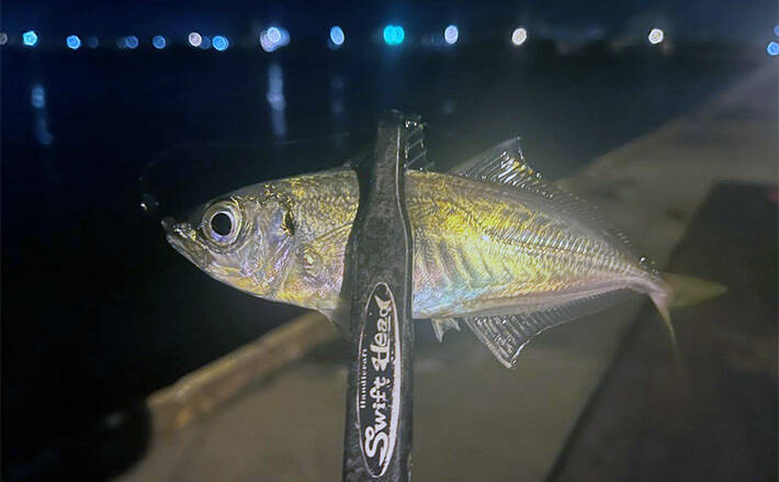 慎重に寄せて抜くと先ほどよりはサイズアップしたアジ。やはりサバの群れが多すぎてアジのレンジにルアーが入っていなかったようだ。3匹目のアジもすぐにヒット。今度も同じレンジであった。