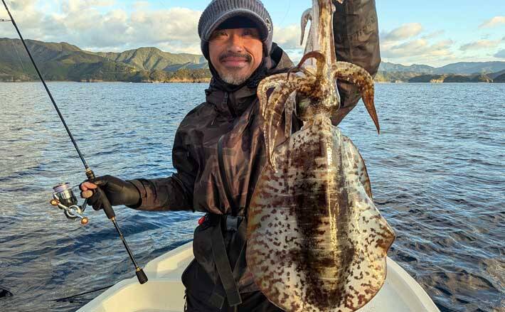 この後、さらに風が強くなってきた。船はよく流れるが、肝心のアオリイカのアタリが遠い。諦めムードとなってきた時間帯に再び阿部さんに2匹目の本命がヒット。
